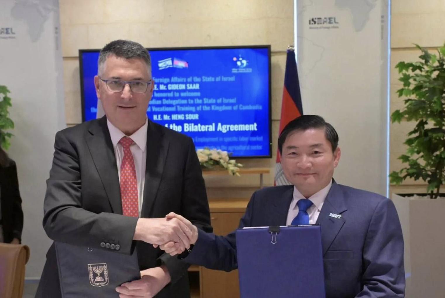 (ហ៊្សេរុយសាឡិម)៖ នៅរសៀលថ្ងៃទី១ ខែធ្នូ ឆ្នាំ២០២៥ លោក ហេង សួរ រដ្ឋមន្ត្រីក្រសួងការងារ និងបណ្តុះបណ្តាលវិជ្ជាជីវៈ និងលោក ហ្គីដន សាអា (Gideon Sa'ar) រដ្ឋមន្រ្តីក្រសួងការបរទេស នៃរដ្ឋអុីស្រាអែល បានចុះហត្ថលេខាលើកិច្ចព្រមព្រៀងស្តីពីកិច្ចសហប្រតិបត្តិការលើវិស័យការងារ ដែលបើកទំព័រដំបូងនៃការផ្លាស់ប្តូរកម្លាំងពលកម្មជាមួយគ្នាទៅវិញទៅមក ដែលនឹងកំណត់នូវយន្តការ និងអាចផ្តល់ឱកាសដល់ប្រជាពលរដ្ឋកម្ពុជាអាចពិចារណាក្នុងការទៅធ្វើការងារលើវិស័យកសិកម្ម និងវិស័យផ្សេងទៀតនៅពេលដ៏ខ្លីខាងមុខនេះ។
