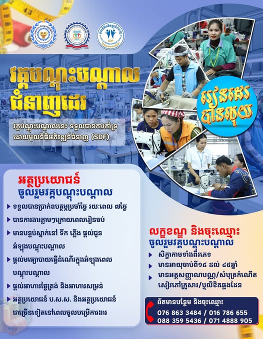 (ភ្នំពេញ)៖ ទីភ្នាក់ងារជាតិមុខរបរ និងការងារ (NEA) នៃក្រសួងការងារ និងបណ្តុះបណ្តាលវិជ្ជាជីវៈ បានជូនដំណឹងអំពីការរៀបចំវគ្គបណ្ដុះបណ្ដាលជំនាញដេរ ដោយឥតគិតថ្លៃ សម្រាប់បងប្អូនអតីតពលករត្រឡប់មកពីថៃ និងប្រជាពលរដ្ឋ ដែលមានបំណងចង់ចូលបំពេញការងារក្នុងវិស័យកាត់ដេរ តែគ្មានបទពិសោធន៍។